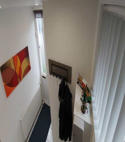 Gaten in de muren bijgewerkt, geschuurd en muurverf, 'Iets Turf', aangebracht. Het oogt weer lekker fris.