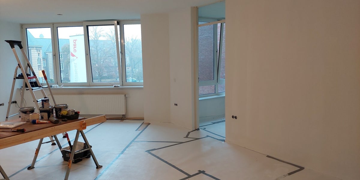 Het leggen van laminaat in het gehele appartement en 'doorleggen' zonder drempels, zodat een mooi geheel is ontstaan.