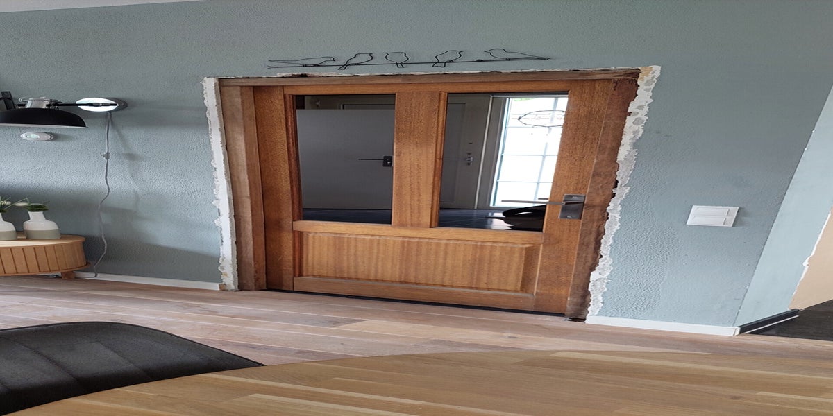 Toegangsdeur naar de keuken verwijderd en dichtgemaakt en 'nieuwe' hergebruikte deur in de woonkamer gemaakt. Uiteraard moet de afwerking en het schilderwerk nog gebeuren.